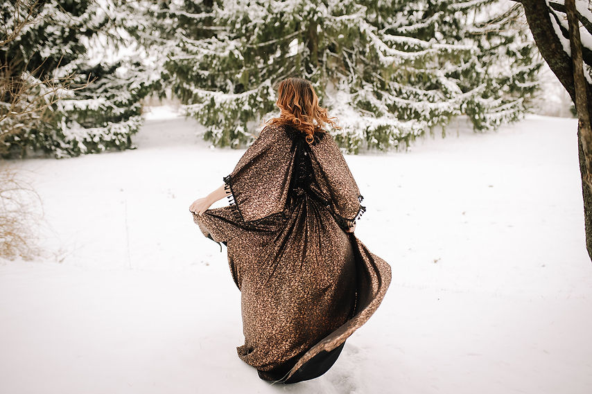 Gold, super sparkly in the sun dress that is flowy and great for movement. Adjustable from S-XL